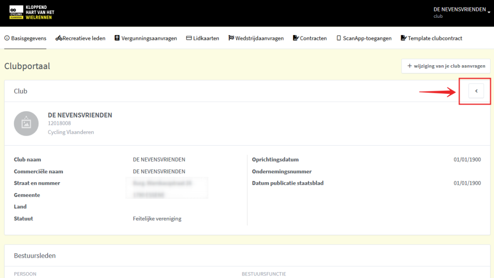 Het tabblad Basisgegevens toont de gegevens die over de club gekend zijn bij Cycling Vlaanderen.