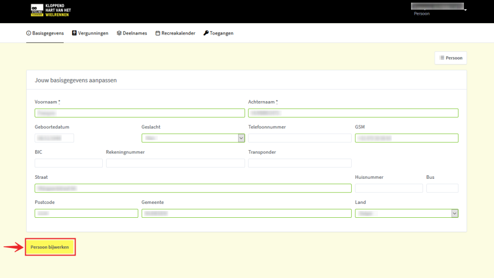 Het tabblad Basisgegevens toont de gegevens die over de persoon gekend zijn bij Cycling Vlaanderen.