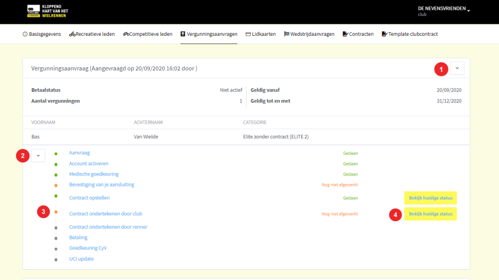Contracten die ondertekend moeten worden door de club, vind je als club onder het tabblad Vergunningsaanvragen waar je een overzicht vindt van alle aanvragen die momenteel lopende zijn om bij de club aan te sluiten.