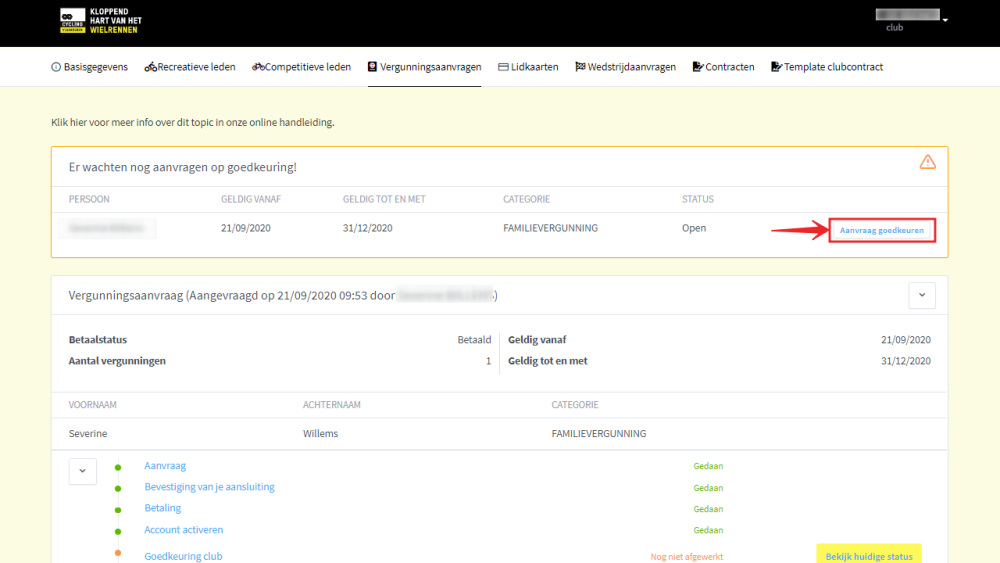De club keurt de aanvraag goed door op Aanvraag goedkeuren te klikken op het tabblad Vergunningsaanvragen.
