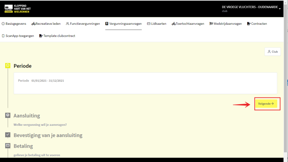 Je komt op het scherm terecht waar je achtereenvolgens de periode van de verlenging, de categorie en de club kan bevestigen.