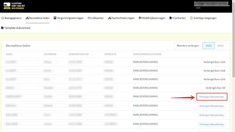 Als club kan je de lidmaatschappen van een lid verlengen voor het volgende jaar.