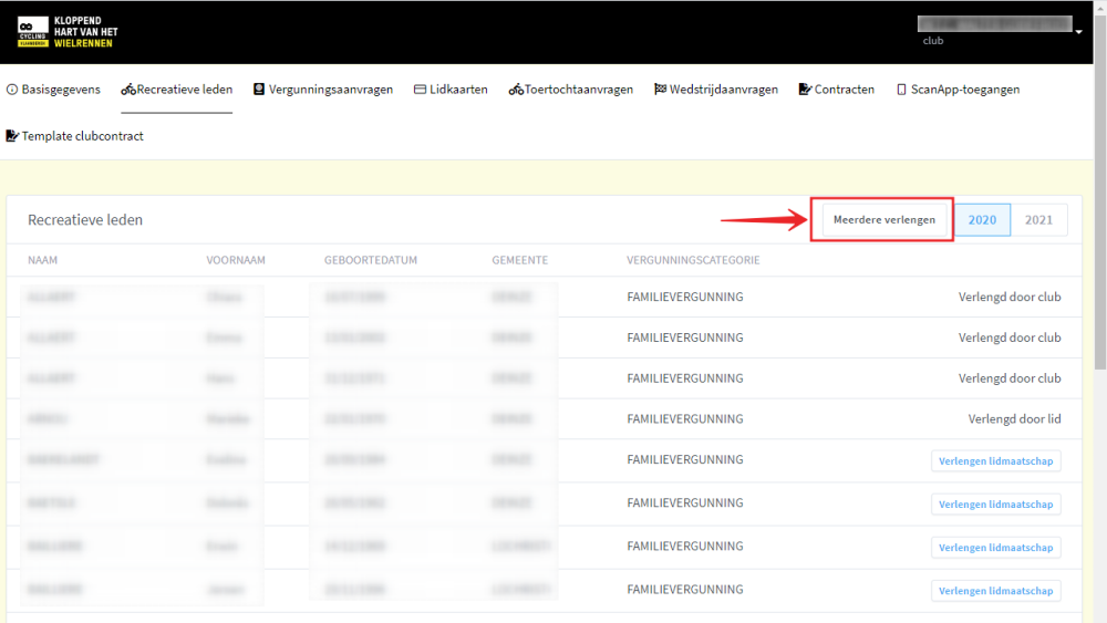 Als club kan je de lidmaatschappen van verschillende leden tegelijk verlengen voor het volgende jaar.