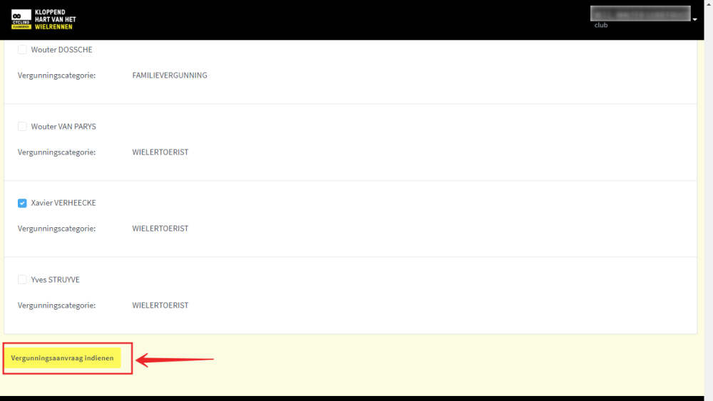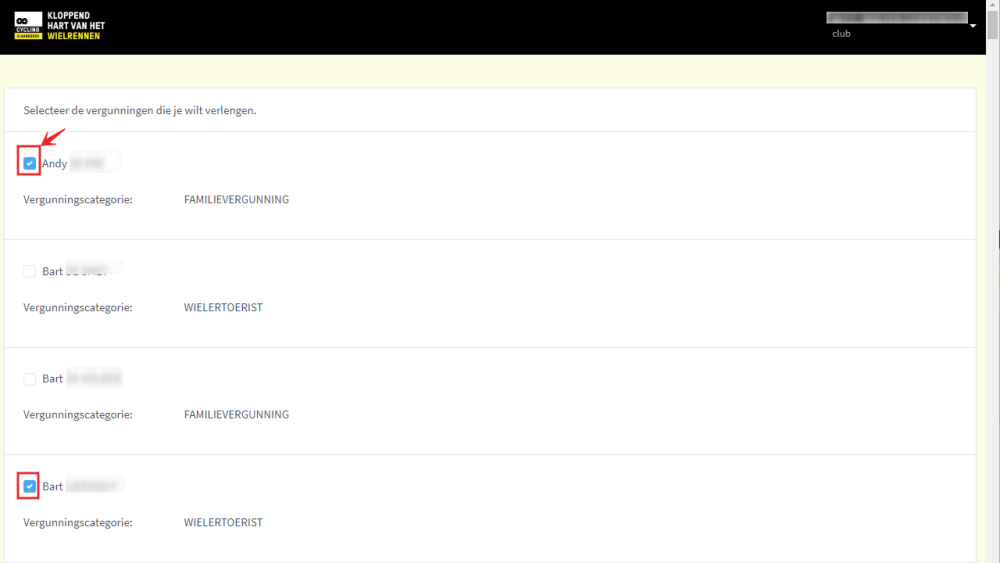 Je komt op het scherm terecht waar je de leden kan aanvinken van wie je het lidmaatschap wil verlengen.