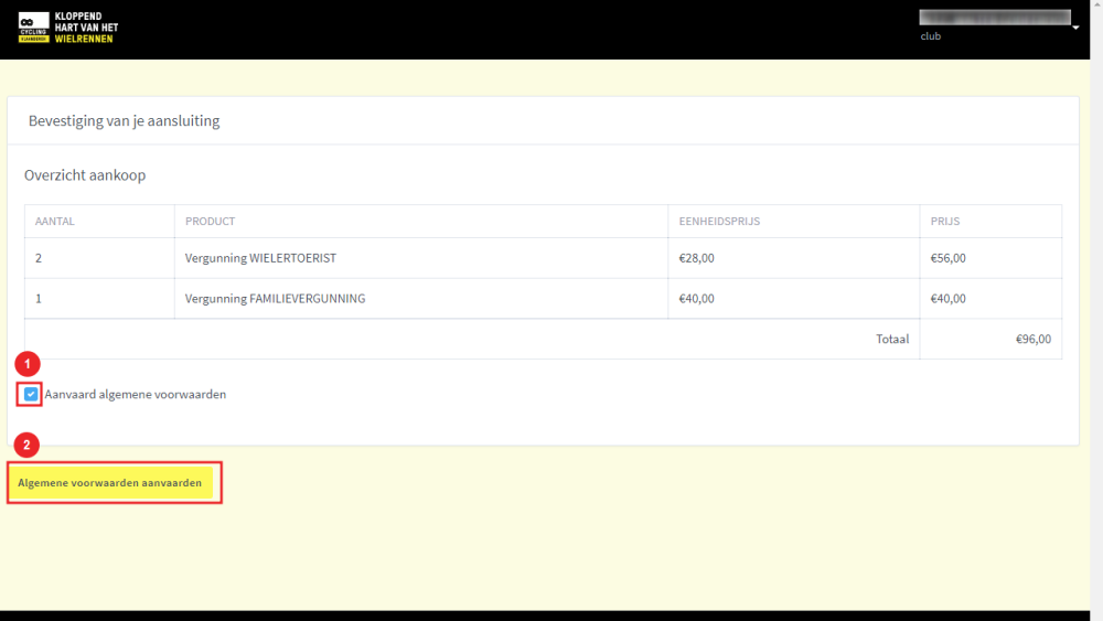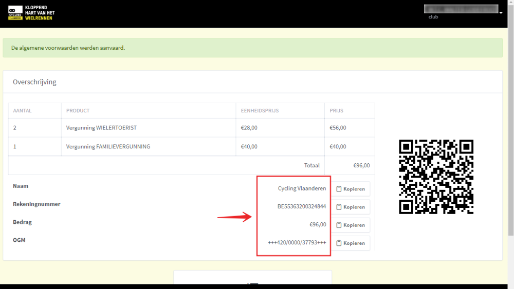 Er wordt nu een collectieve betaling aangemaakt voor deze leden. Verklaar je akkoord met de algemene voorwaarden en klik op indienen.