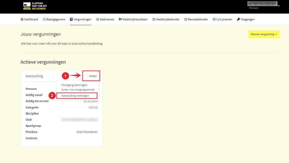 Wil je je huidige vergunning bij DEZELFDE club verlengen voor het volgende jaar, dan kan dit door op de vergunningsfiche op de knop Aansluiting verlengen te klikken.