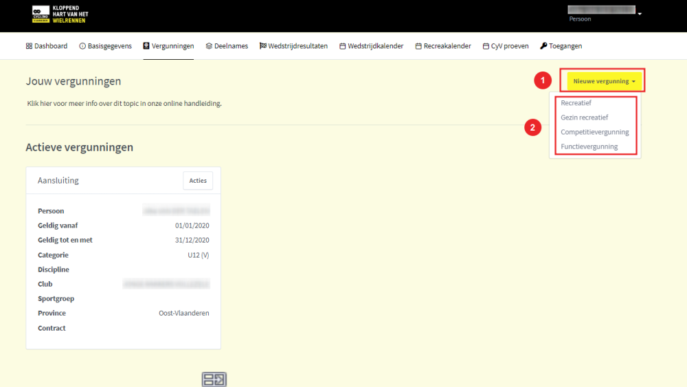 Wil je aansluiten bij een ANDERE club en je huidige aansluiting dus niet verlengen, klik dan op Nieuwe vergunning en vervolgens maak je een keuze uit de soort vergunning die je wil nemen (Recreatief – Gezin recreatief – Competitievergunning – Functievergunning).