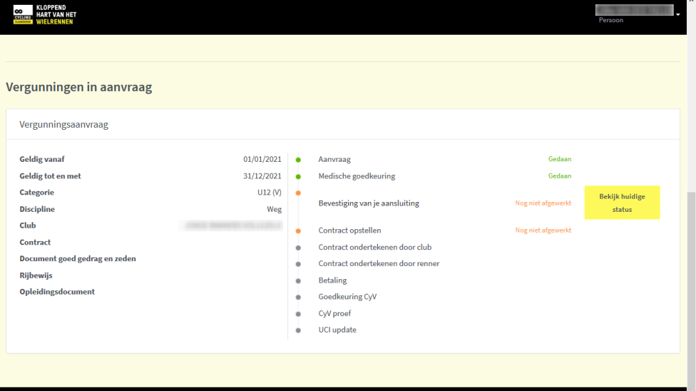 Je aanvraag is nu gedaan. De club waarbij je aansluit, krijgt een e-mail zodat ze op de hoogte is van je aanvraag. Je kan de aanvraag nu verder afwerken en opvolgen via het tabblad Vergunningen. Onderaan dit tabblad vind je de Vergunningen in aanvraag terug, met alle stappen die moeten worden doorlopen voor het afronden van de aanvraag.