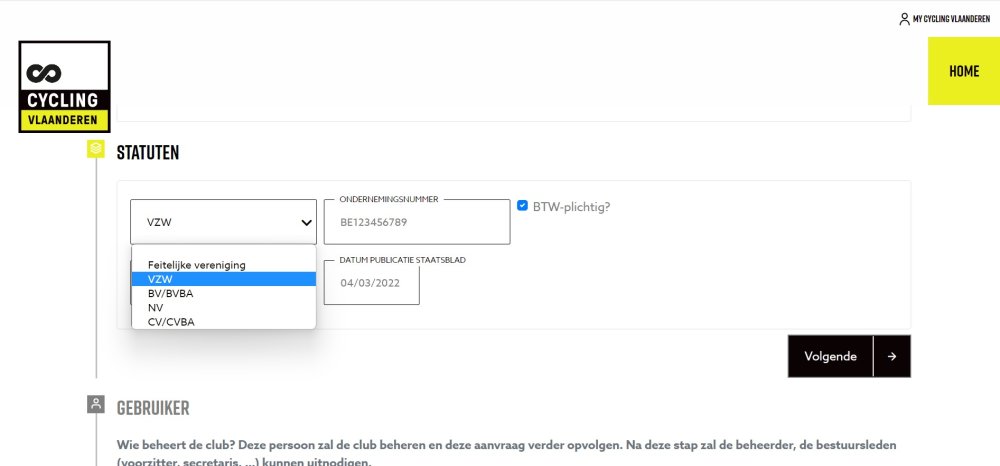 Selecteer wat het statuut zal zijn van uw club en vul de gevraagde gegevens in.
