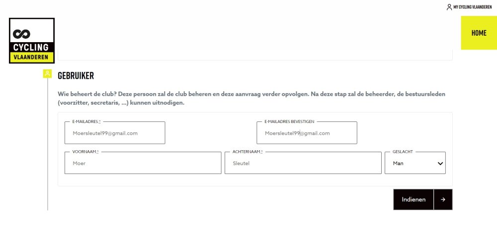 Vul de persoonlijke gegevens in van de club-beheerder. Deze persoon moet geen lid zijn van Cycling Vlaanderen om verder te gaan.