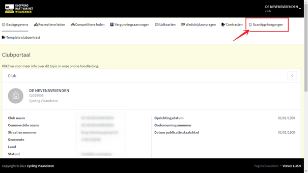 1. De club logt in op het clubportaal en klikt op ‘ScanApp-toegangen’.