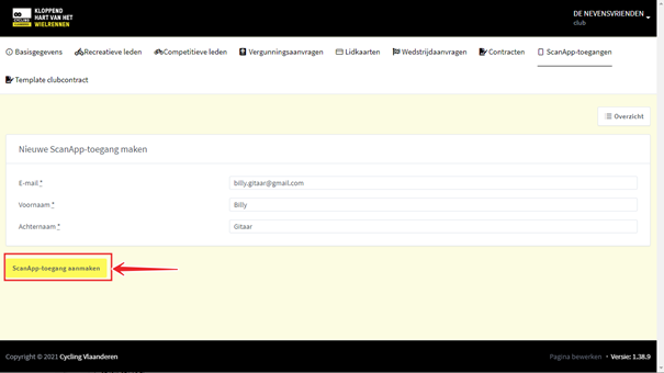3. De clubverantwoordelijke geeft het e-mailadres, de naam en voornaam op van de scanapp-medewerker en bevestigt via ‘ScanApp-toegang aanmaken’.