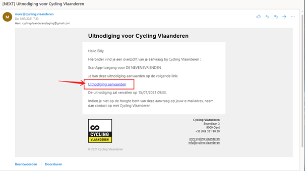 4. De scanapp-medewerker ontvangt een mail met een uitnodiging om scanapp-medewerker te worden. Hij aanvaardt de uitnodiging en geeft wachtwoord op voor zijn portaal. Met datzelfde e-mailadres en wachtwoord zal de persoon ook in de SCANAPP (NIEUWE VERSIE!!!) kunnen inloggen om te scannen.