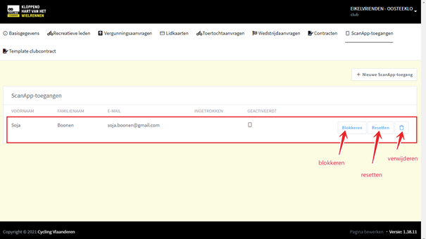 5. De clubmedewerker kan een bestaande toegang steeds verwijderen / blokkeren of resetten.