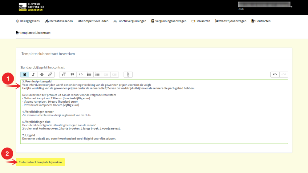 - Je klikt op de knop ‘Club contract template bijwerken’ om de tekst op te slaan.
