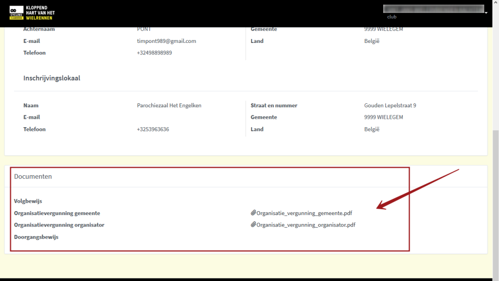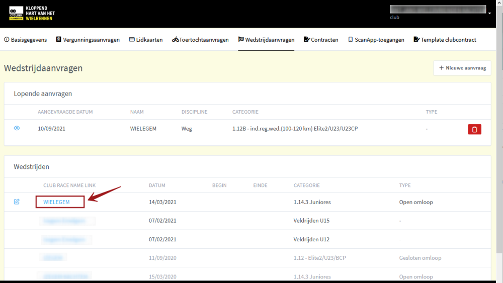 Om de organisatievergunning en eventueel de doorgangsbewijzen en volgbewijzen af te halen, klik je op de wedstrijdnaam in de lijst van de wedstrijden.