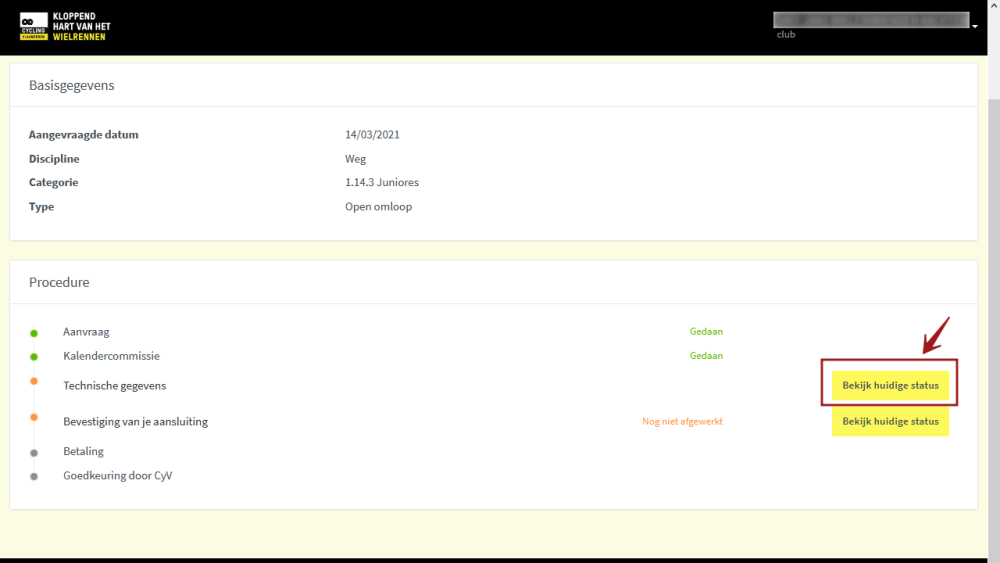 Klik op de knop Bekijk huidige status om de wedstrijdgegevens te bekijken, in te voeren of aan te passen. Dit kan tot 1 maand voor de wedstrijd. Indien je nadien nog aanpassingen wil doorvoeren, dien je rechtstreeks te mailen naar onze administratie (info@cycling.vlaanderen).
