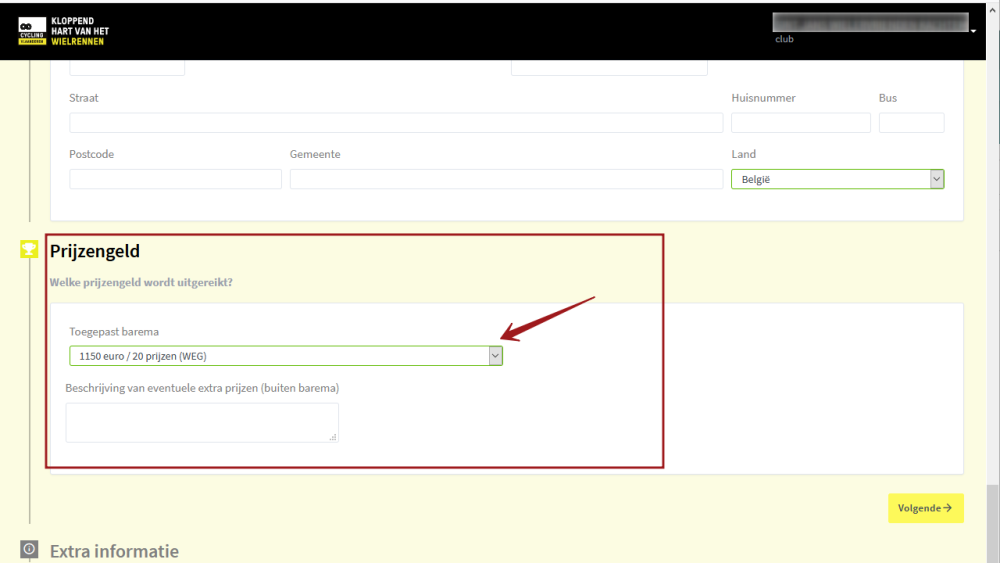 Bij het item Prijzengeld krijg je het minimumbedrag aan prijzengeld te zien voor de desbetreffende wedstrijdcategorie. Eventueel kan je wel voor een hoger barema kiezen, niet voor een lager.